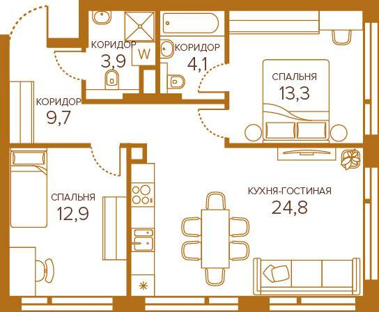 Общая площадь квартиры - 68.7 кв.м. В квартире выполнена премиальная отделка в неоклассическом стиле.