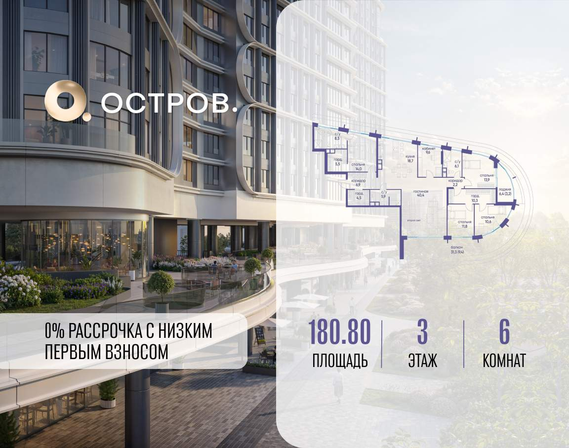 Продаётся квартира от застройщика: общая площадь 180.80 м, жилая 59.90 м, кухня 59.10 м, 3-й этаж, жилой квартал «Остров 7», корпус 3 (секция 1) . Срок сдачи: 1 квартал 2028 года.
