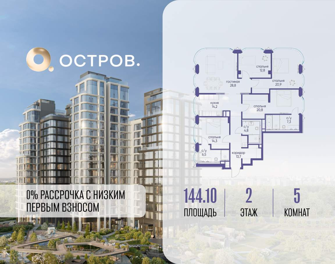 Продаётся квартира от застройщика: общая площадь 144.10 м, жилая 97.60 м, кухня 14.20 м, 2-й этаж, жилой квартал «Остров 12», корпус 2 (секция 1) . Срок сдачи: 1 квартал 2029 года.