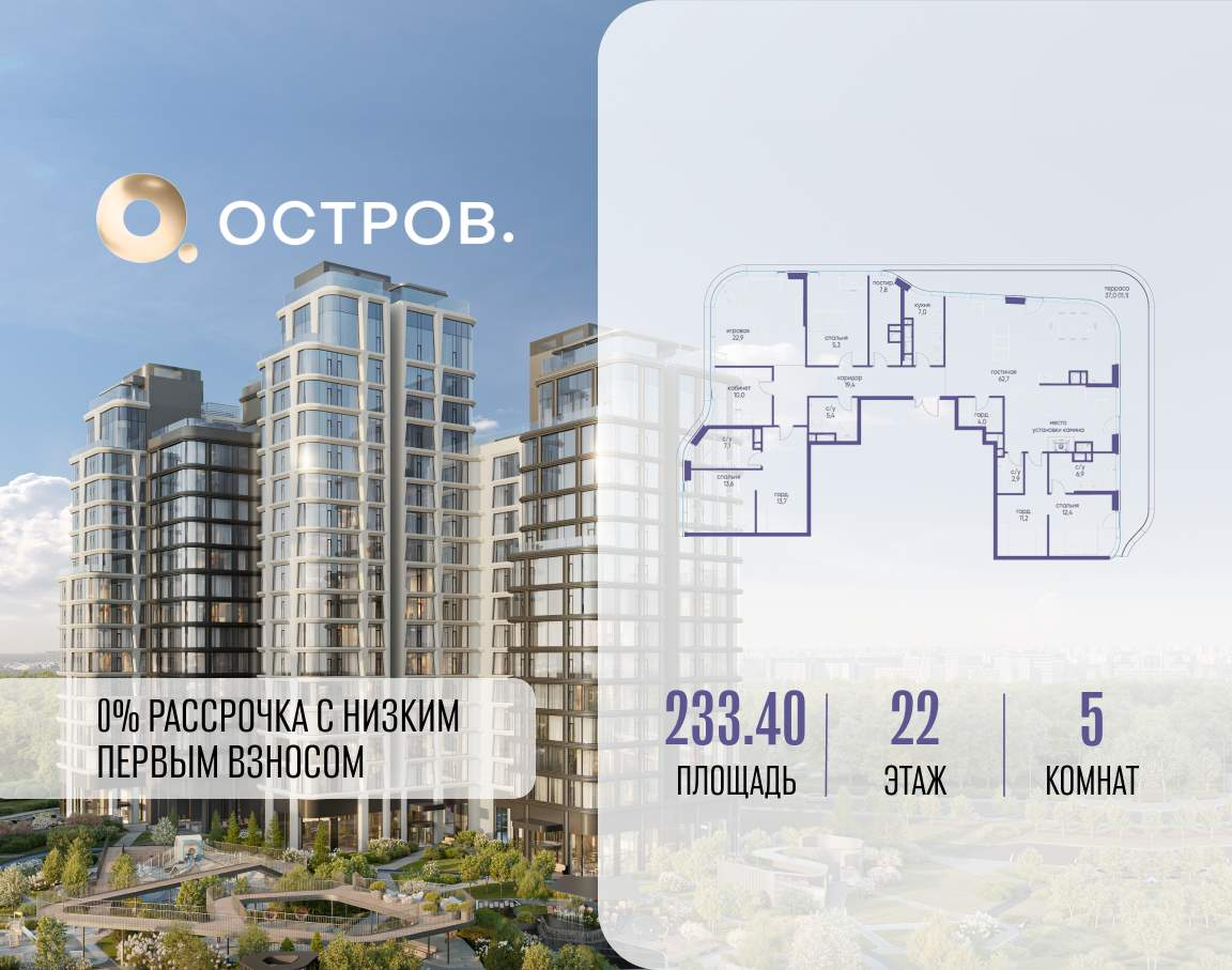 Продаётся квартира от застройщика: общая площадь 233.40 м, жилая 126.90 м, кухня 7.00 м, 22-й этаж, жилой квартал «Остров 12», корпус 3 (секция 1) . Срок сдачи: 1 квартал 2029 года.