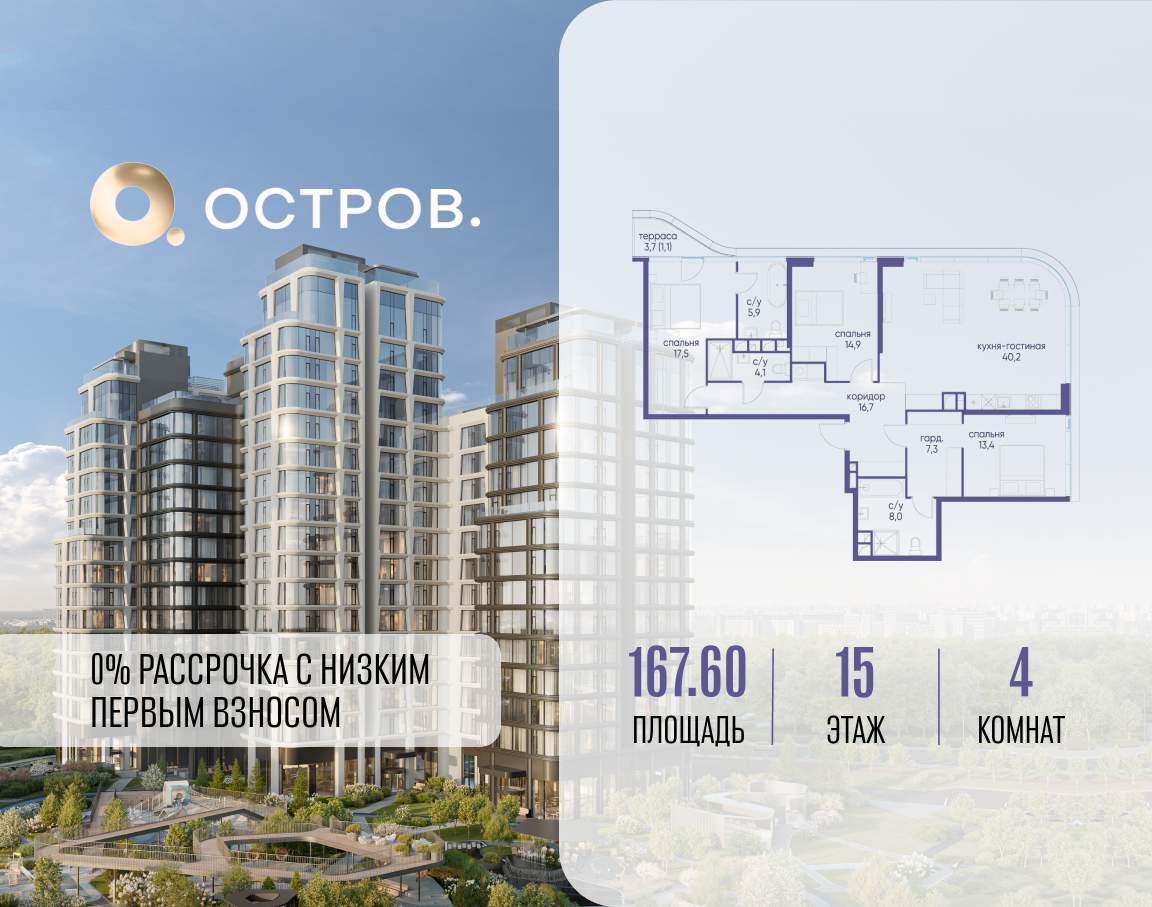 Продаётся 4-комн. квартира от застройщика: общая площадь 167.60 м, жилая 45.80 м, кухня 40.20 м, 15-й этаж, жилой квартал «Остров 12», корпус 6 (секция 1) . Срок сдачи: 1 квартал 2029 года.