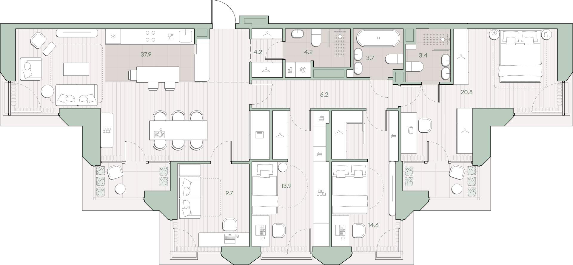 Жилая площадь 59 м2, кухня 37.9 м2, предчистовая отделка, комнаты изолированные.