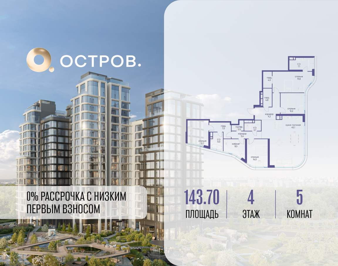 Продаётся квартира от застройщика: общая площадь 143.70 м, жилая 67.20 м, кухня 45.10 м, 4-й этаж, жилой квартал «Остров 12», корпус 2 (секция 1) . Срок сдачи: 1 квартал 2029 года.
