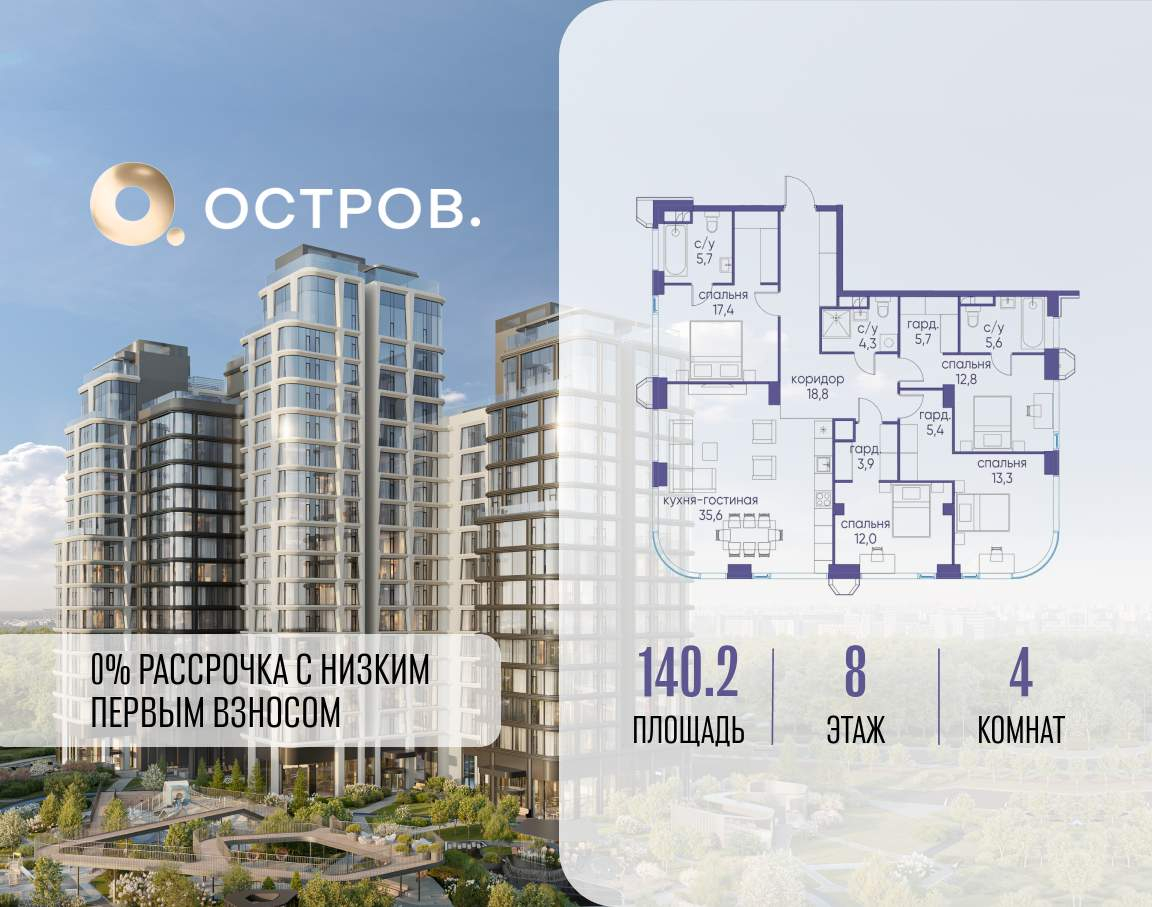 Продаётся 4-комн. квартира от застройщика: общая площадь 140.20 м, жилая 55.50 м, кухня 35.60 м, 8-й этаж, жилой квартал «Остров 12», корпус 1 (секция 1) . Срок сдачи: 1 квартал 2029 года.