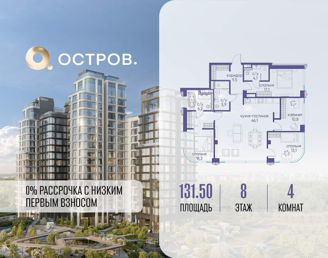 Продаётся 4-комн. квартира от застройщика: общая площадь 131.50 м, жилая 59.30 м, кухня 46.10 м, 8-й этаж, жилой квартал «Остров 12», корпус 1 (секция 3) . Срок сдачи: 1 квартал 2029 года.