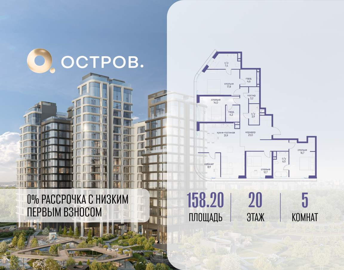 Продаётся квартира от застройщика: общая площадь 158.20 м, жилая 70.10 м, кухня 31.90 м, 20-й этаж, жилой квартал «Остров 12», корпус 3 (секция 1) . Срок сдачи: 1 квартал 2029 года.