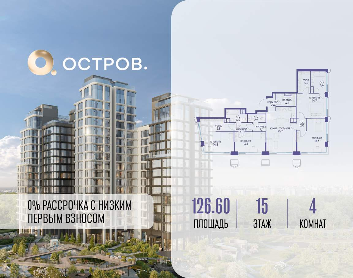 Продаётся 4-комн. квартира от застройщика: общая площадь 126.60 м, жилая 61.10 м, кухня 25.70 м, 15-й этаж, жилой квартал «Остров 12», корпус 3 (секция 1) . Срок сдачи: 1 квартал 2029 года.