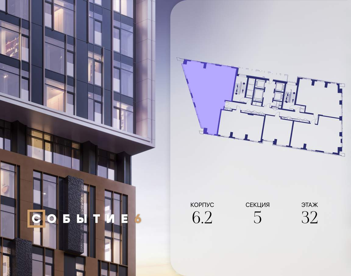 Продаётся 4-комнатная квартира от застройщика: общая площадь 130.80 м, жилая 59.90 м, кухня 28.10 м, 32-й этаж, жилой квартал «Событие-6», корпус 2 (секция 5) Срок сдачи: 4 квартал 2029 года.