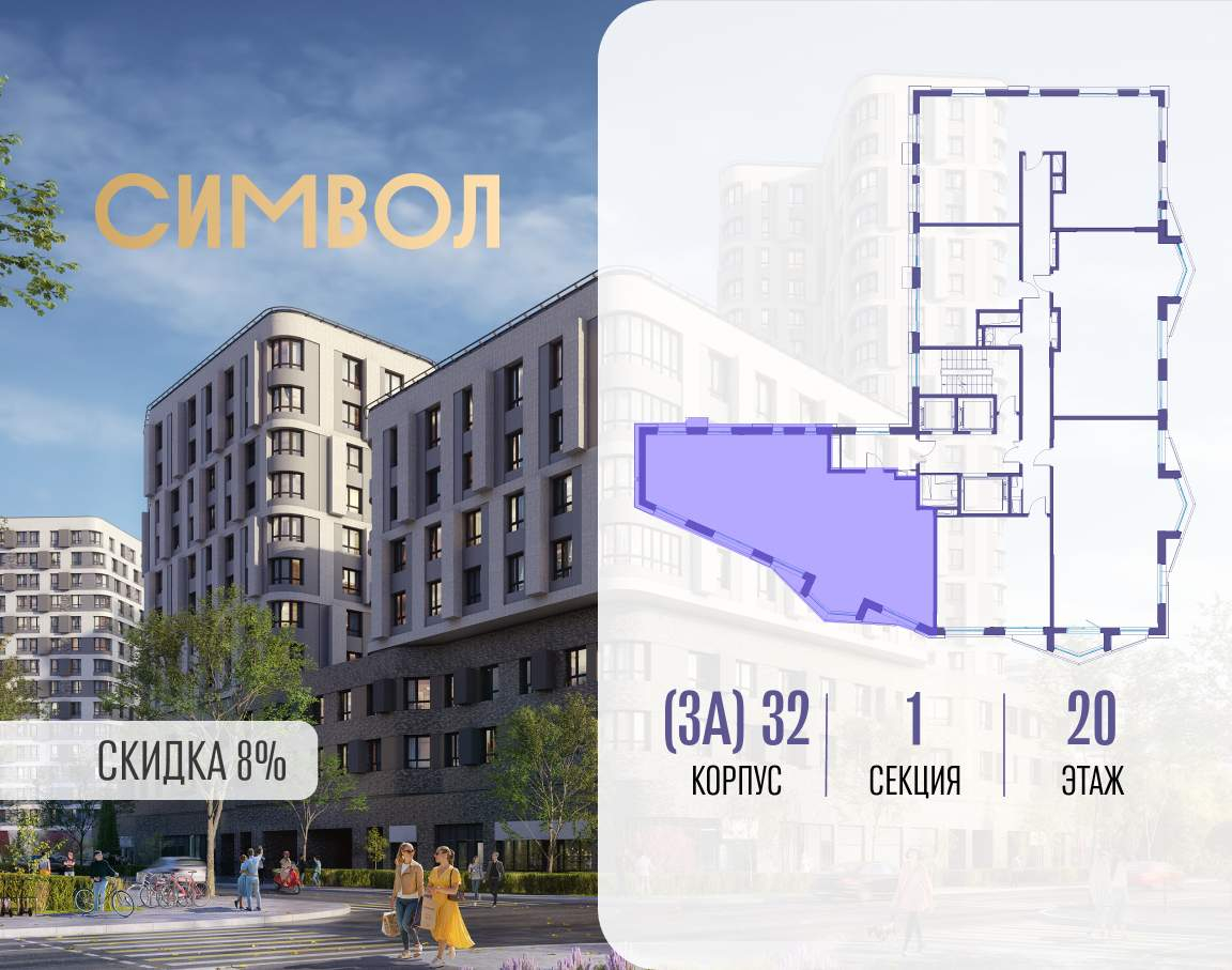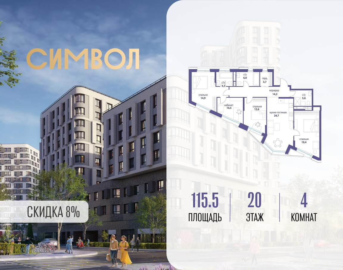 Продается 4-комнатная квартира от застройщика: общая площадь 115.50 м, жилая 57.40 м, кухня 24.70 м, 20-й этаж, жилой квартал «Вдохновение», корпус 32 (секция 1) . Срок сдачи: 4 квартал 2027 года.