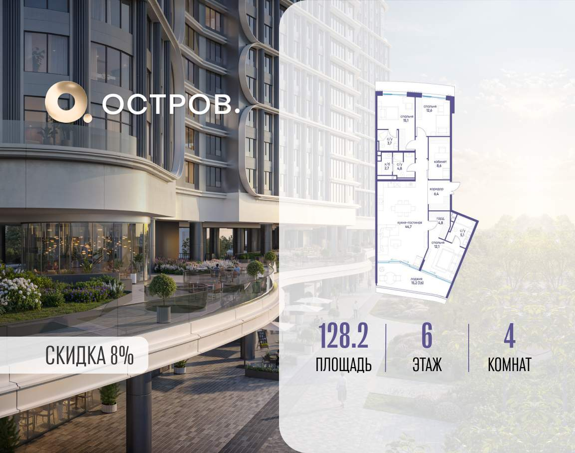 Продаётся 4-комн. квартира от застройщика: общая площадь 128.20 м, жилая 48.40 м, кухня 44.70 м, 6-й этаж, жилой квартал «Остров 7», корпус 4 (секция 2) . Срок сдачи: 1 квартал 2028 года.