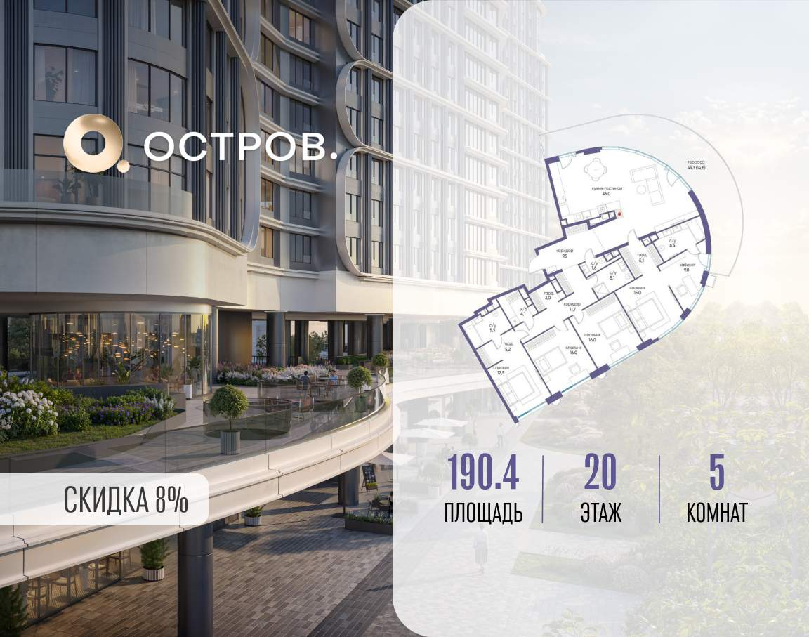 Продаётся квартира от застройщика: общая площадь 190.40 м, жилая 69.30 м, кухня 49.00 м, 20-й этаж, жилой квартал «Остров 7», корпус 7 (секция 2) . Срок сдачи: 3 квартал 2028 года.