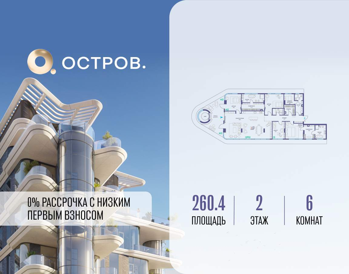 Продаётся квартира от застройщика: общая площадь 260.40 м, жилая 84.00 м, кухня 83.30 м, 2-й этаж, жилой квартал «Остров 10», (секция 1) . Срок сдачи: 2 квартал 2026 года.