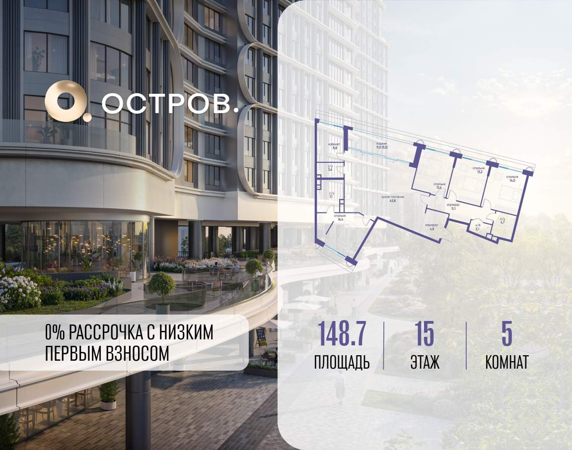 Продаётся квартира от застройщика: общая площадь 148.70 м, жилая 66.00 м, кухня 43.80 м, 15-й этаж, жилой квартал «Остров 7», корпус 7 (секция 2) . Срок сдачи: 3 квартал 2028 года.