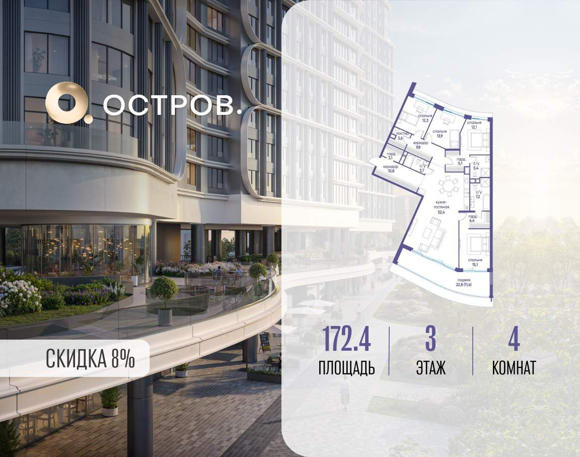 Продаётся 4-комн. квартира от застройщика: общая площадь 172.40 м, жилая 53.40 м, кухня 52.40 м, 3-й этаж, жилой квартал «Остров 7», корпус 5 (секция 2) . Срок сдачи: 3 квартал 2028 года.
