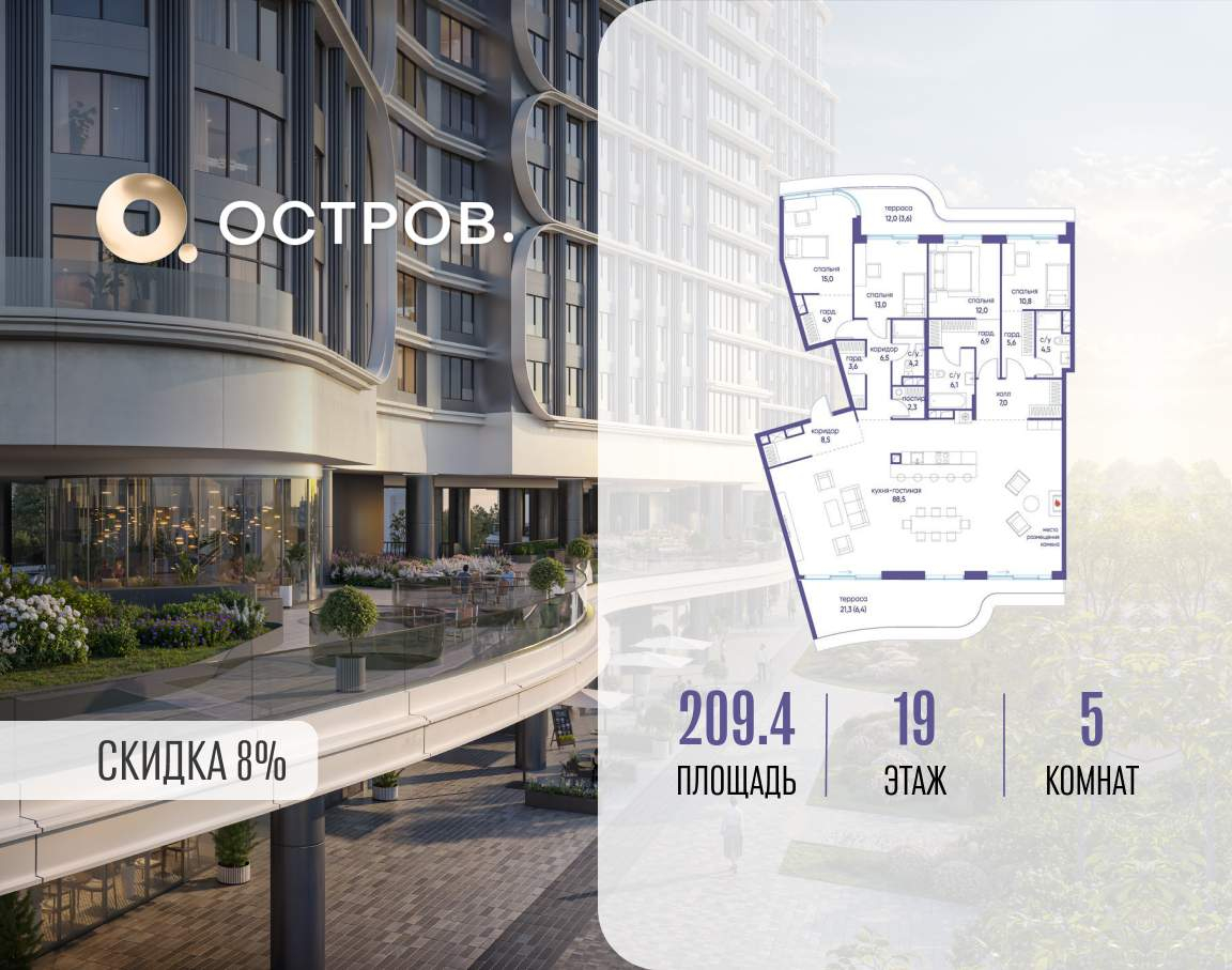 Продаётся квартира от застройщика: общая площадь 209.40 м, жилая 50.80 м, кухня 88.50 м, 19-й этаж, жилой квартал «Остров 7», корпус 2 (секция 2) . Срок сдачи: 1 квартал 2028 года.