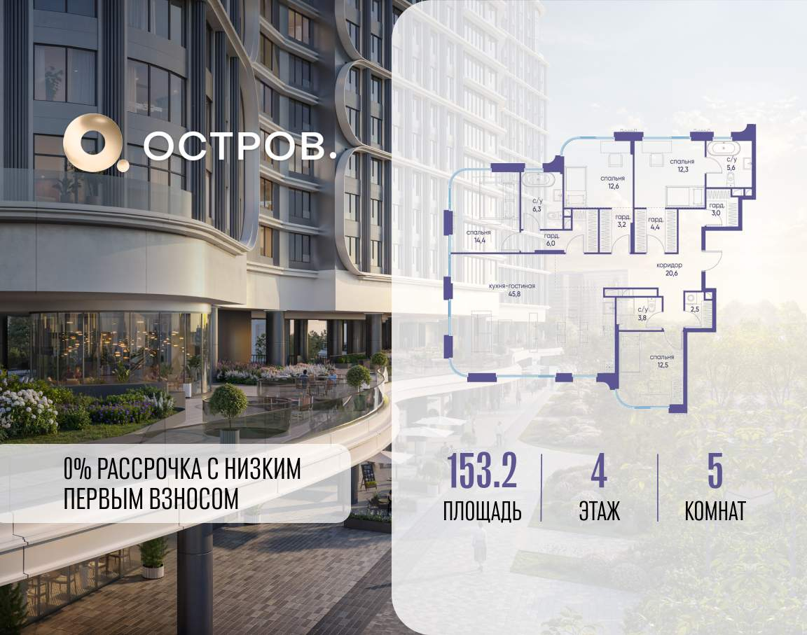 Продаётся 4-комн. квартира от застройщика: общая площадь 149.50 м, жилая 68.90 м, кухня 47.80 м, 9-й этаж, жилой квартал «Остров 12», корпус 2 (секция 1) . Срок сдачи: 1 квартал 2029 года.