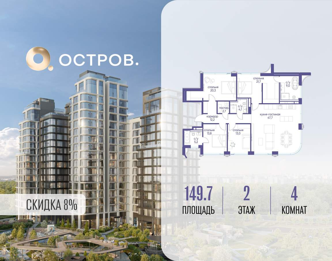 Продаётся 4-комн. квартира от застройщика: общая площадь 149.70 м, жилая 68.80 м, кухня 47.70 м, 2-й этаж, жилой квартал «Остров 12», корпус 2 (секция 1) . Срок сдачи: 1 квартал 2029 года.