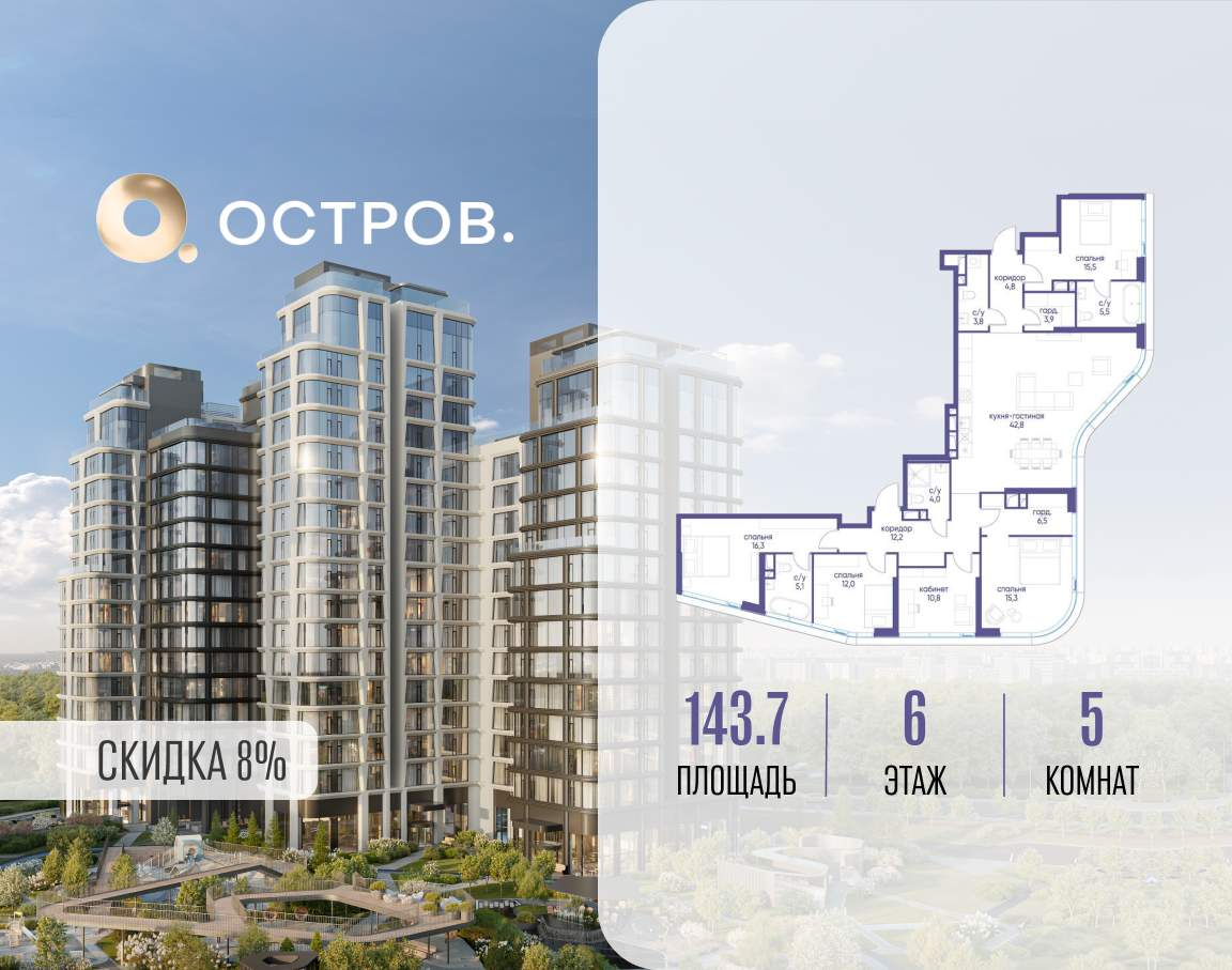 Продаётся квартира от застройщика: общая площадь 143.70 м, жилая 69.90 м, кухня 42.80 м, 6-й этаж, жилой квартал «Остров 12», корпус 2 (секция 1) . Срок сдачи: 1 квартал 2029 года.