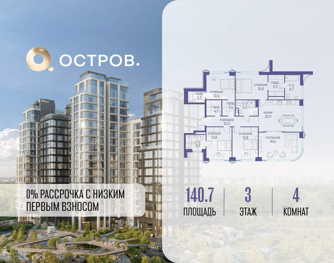 Продаётся 4-комн. квартира от застройщика: общая площадь 140.70 м, жилая 55.80 м, кухня 42.50 м, 3-й этаж, жилой квартал «Остров 12», корпус 1 (секция 1) . Срок сдачи: 1 квартал 2029 года.