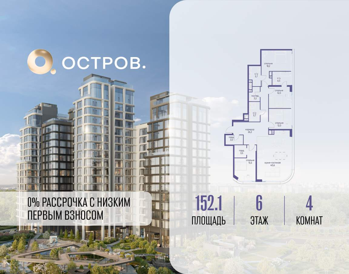 Продаётся 4-комн. квартира от застройщика: общая площадь 152.10 м, жилая 57.70 м, кухня 40.60 м, 6-й этаж, жилой квартал «Остров 12», корпус 6 (секция 1) . Срок сдачи: 1 квартал 2029 года.