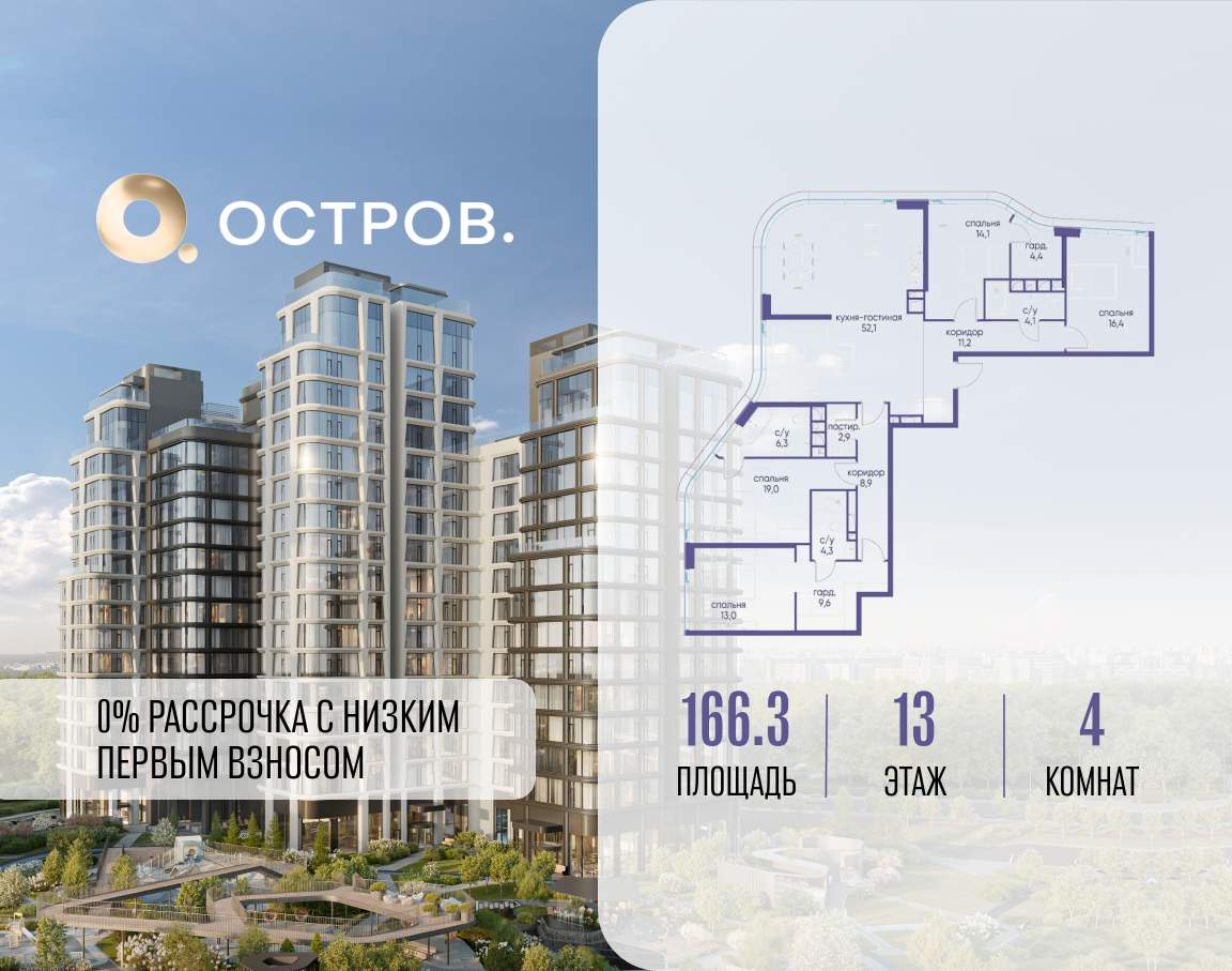 Продаётся 4-комн. квартира от застройщика: общая площадь 166.30 м, жилая 62.50 м, кухня 52.10 м, 13-й этаж, жилой квартал «Остров 12», корпус 6 (секция 1) . Срок сдачи: 1 квартал 2029 года.