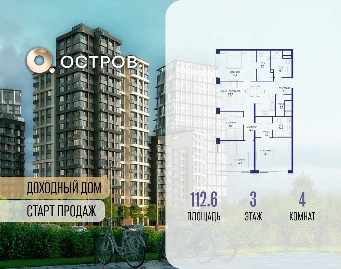Продаётся 4-комн. квартира от застройщика: общая площадь 128.00 м, жилая 59.80 м, кухня 31.90 м, 19-й этаж, жилой квартал «Остров 14», корпус 6 (секция 1) . Срок сдачи: 2 квартал 2029 года.