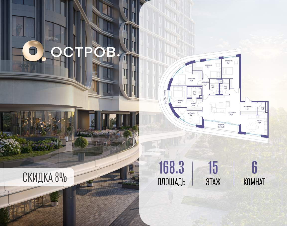 Продаётся квартира от застройщика: общая площадь 168.30 м, жилая 109.80 м, кухня 17.30 м, 15-й этаж, жилой квартал «Остров 7», корпус 4 (секция 3) . Срок сдачи: 1 квартал 2028 года.