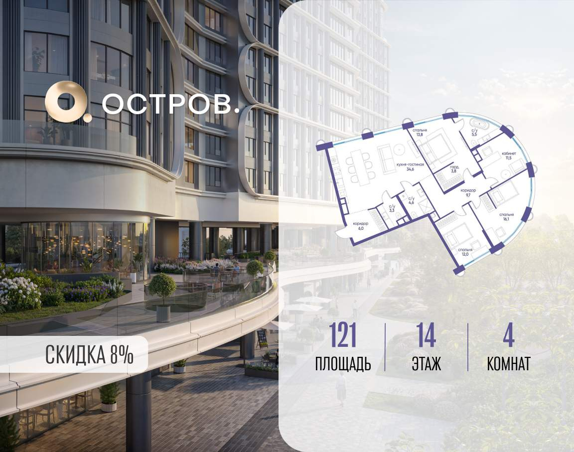 ОСТРОВ от Донстрой - жилой комплекс на западе Москвы, в Мневниковской пойме. Уникальное преимущество комплекса - в том, что он обособлен от города рекой и природным парком (650 га) . Благодаря природному окружению эта территория имеет лучший экологический рейтинг в столице. Кварталы ОСТРОВА объединены ландшафтным дизайном в единое пространство - с набережными и Центральным бульваром. На ОСТРОВЕ любые объекты, необходимые для полноценной жизни и отдыха, находятся на расстоянии 15-минутной прогулки. Торговый центр и супермаркеты, кафе и рестораны, фитнес, салоны красоты, школы и детские сады. А также крупнейший в Москве спортивный кластер.