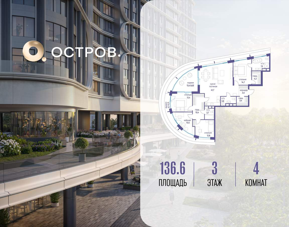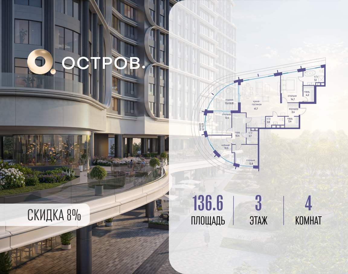 Продаётся 4-комн. квартира от застройщика: общая площадь 136.60 м, жилая 50.40 м, кухня 41.70 м, 3-й этаж, жилой квартал «Остров 7», корпус 3 (секция 2) . Срок сдачи: 1 квартал 2028 года.