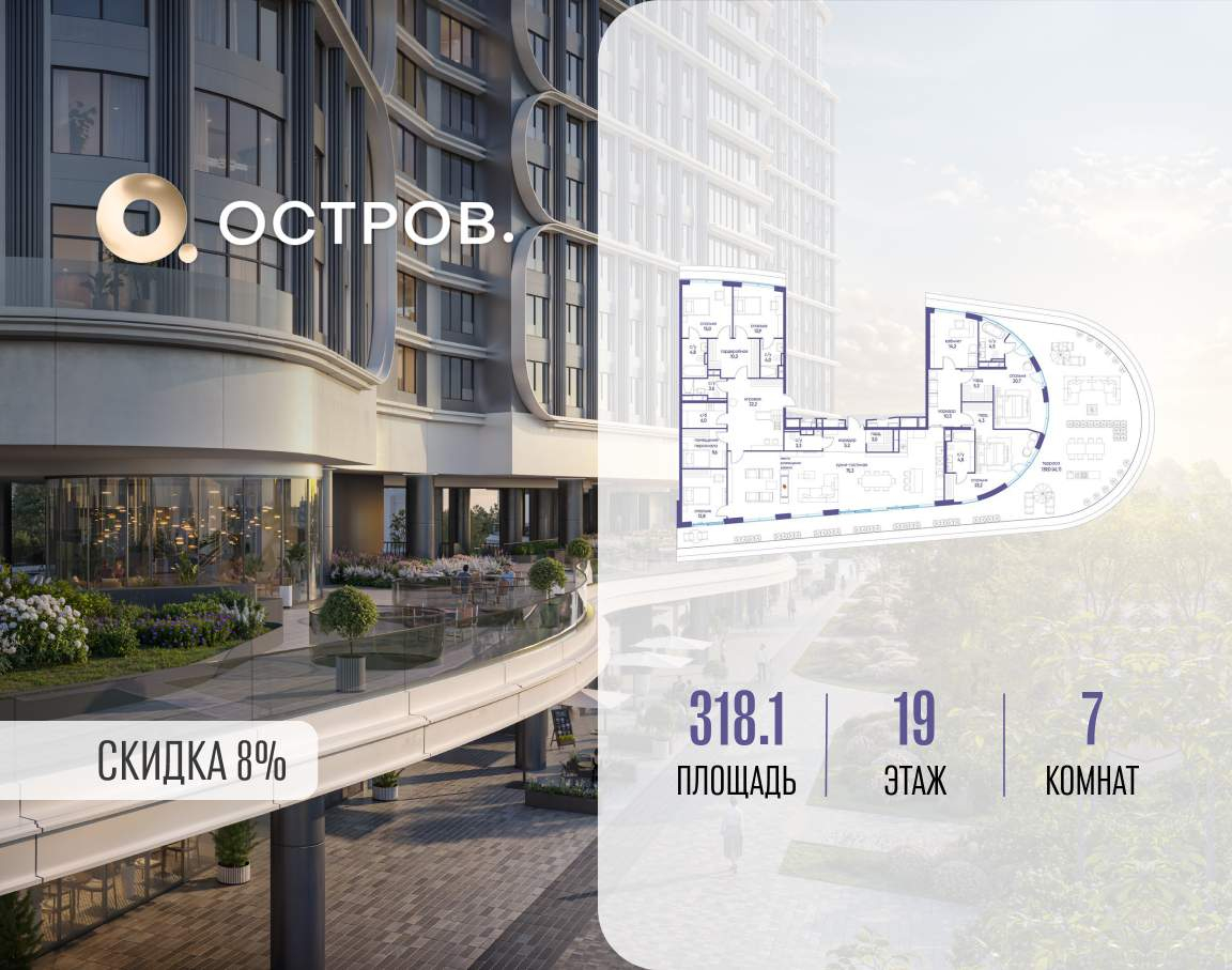 Продаётся квартира от застройщика: общая площадь 318.10 м, жилая 99.80 м, кухня 75.30 м, 19-й этаж, жилой квартал «Остров 7», корпус 4 (секция 1) . Срок сдачи: 1 квартал 2028 года.