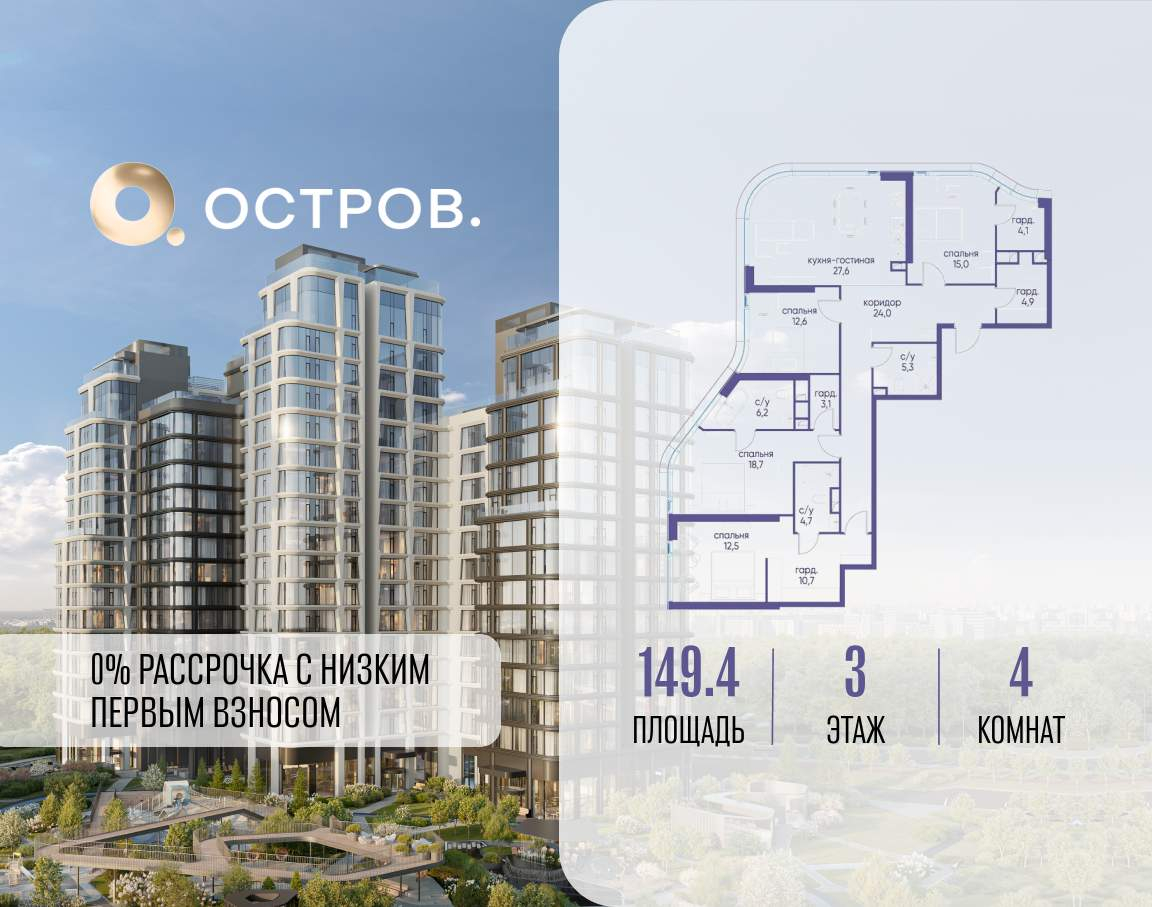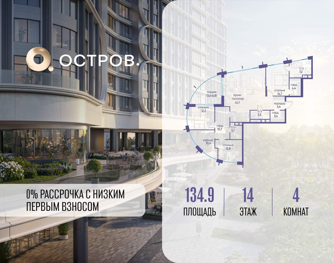 Продаётся 4-комн. квартира от застройщика: общая площадь 128.20 м, жилая 48.40 м, кухня 44.70 м, 16-й этаж, жилой квартал «Остров 7», корпус 4 (секция 2) . Срок сдачи: 1 квартал 2028 года.