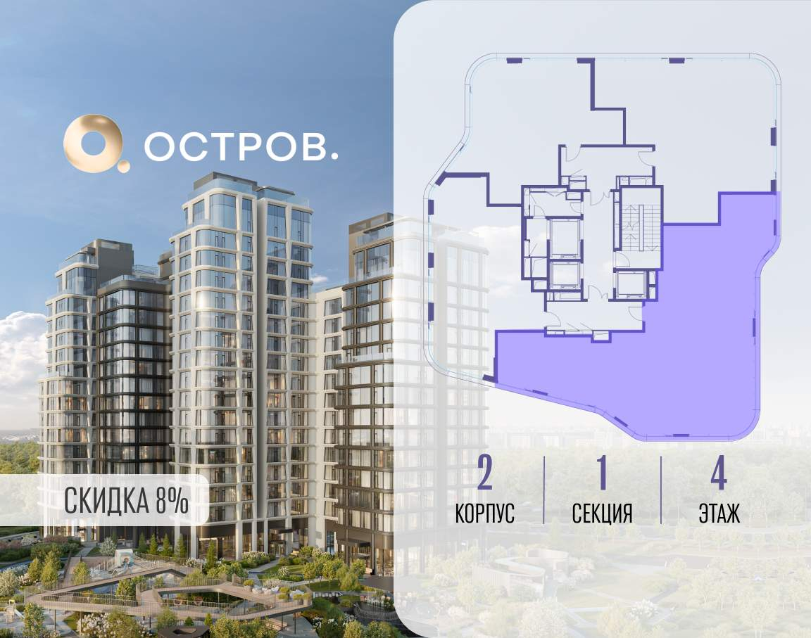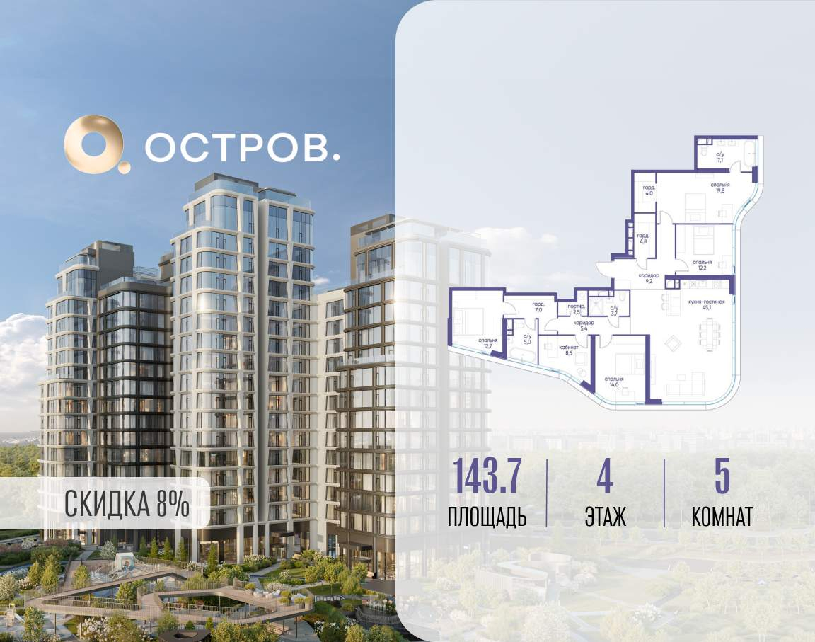 Продаётся квартира от застройщика: общая площадь 143.70 м, жилая 67.20 м, кухня 45.10 м, 4-й этаж, жилой квартал «Остров 12», корпус 2 (секция 1) . Срок сдачи: 1 квартал 2029 года.