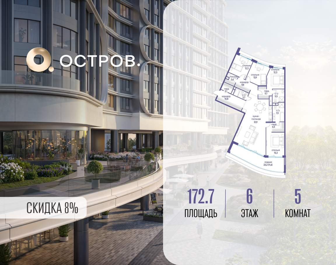 Продаётся квартира от застройщика: общая площадь 172.70 м, жилая 53.80 м, кухня 51.90 м, 6-й этаж, жилой квартал «Остров 7», корпус 3 (секция 2) . Срок сдачи: 1 квартал 2028 года.