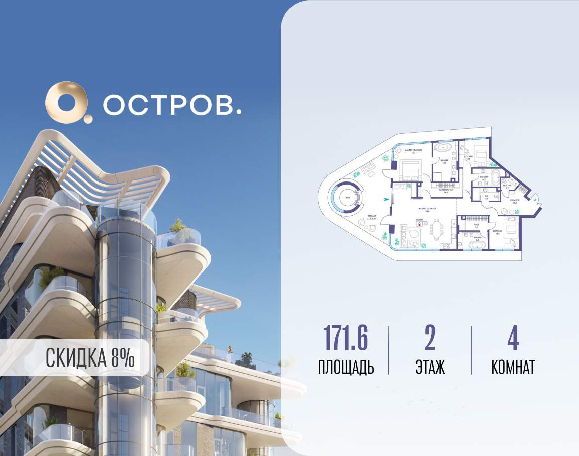 Продаётся 4-комн. квартира от застройщика: общая площадь 171.60 м, жилая 43.60 м, кухня 48.40 м, 2-й этаж, жилой квартал «Остров 10», (секция 1) . Срок сдачи: 2 квартал 2026 года.