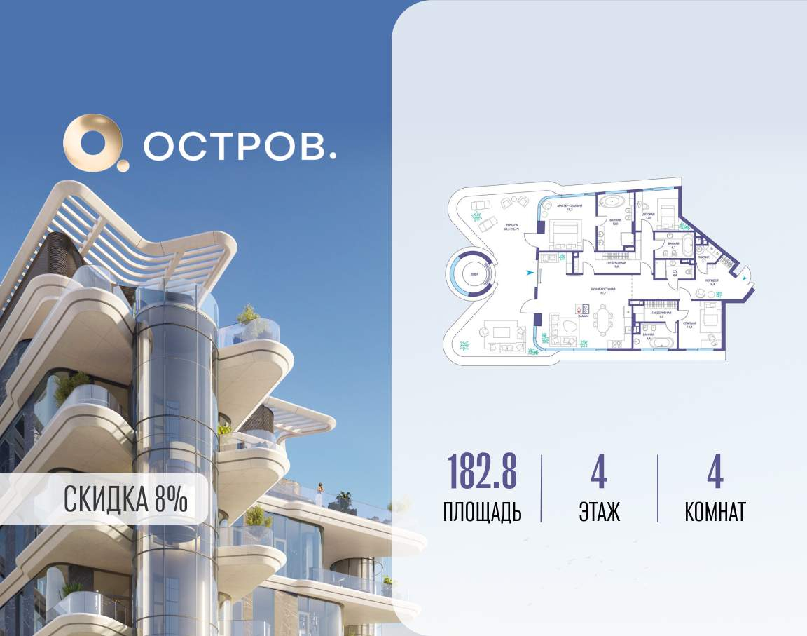 Продаётся 4-комн. квартира от застройщика: общая площадь 182.80 м, жилая 43.60 м, кухня 47.70 м, 4-й этаж, жилой квартал «Остров 10», (секция 1) . Срок сдачи: 2 квартал 2026 года.