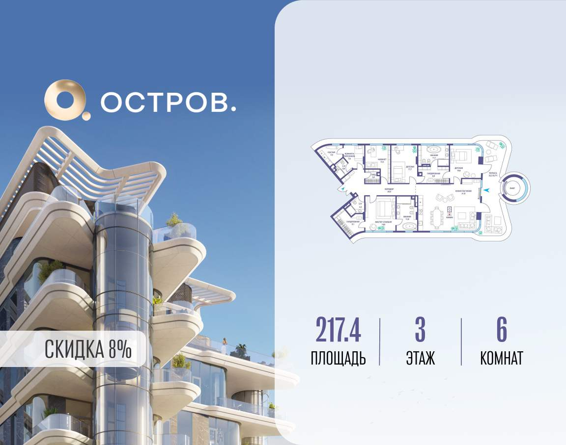 Продаётся квартира от застройщика: общая площадь 217.40 м, жилая 77.40 м, кухня 51.00 м, 3-й этаж, жилой квартал «Остров 10», (секция 1) . Срок сдачи: 2 квартал 2026 года.
