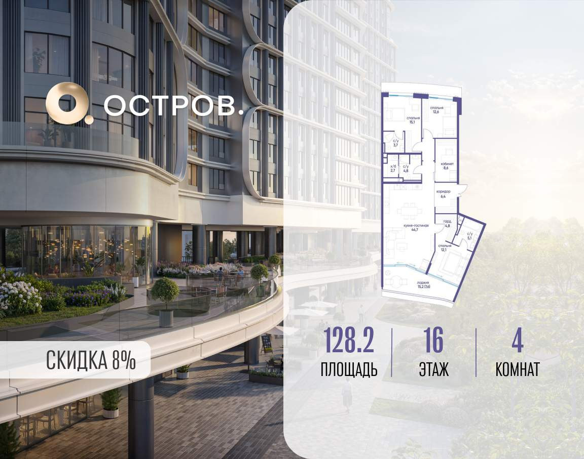Продаётся 4-комн. квартира от застройщика: общая площадь 128.20 м, жилая 48.40 м, кухня 44.70 м, 16-й этаж, жилой квартал «Остров 7», корпус 4 (секция 2) . Срок сдачи: 1 квартал 2028 года.