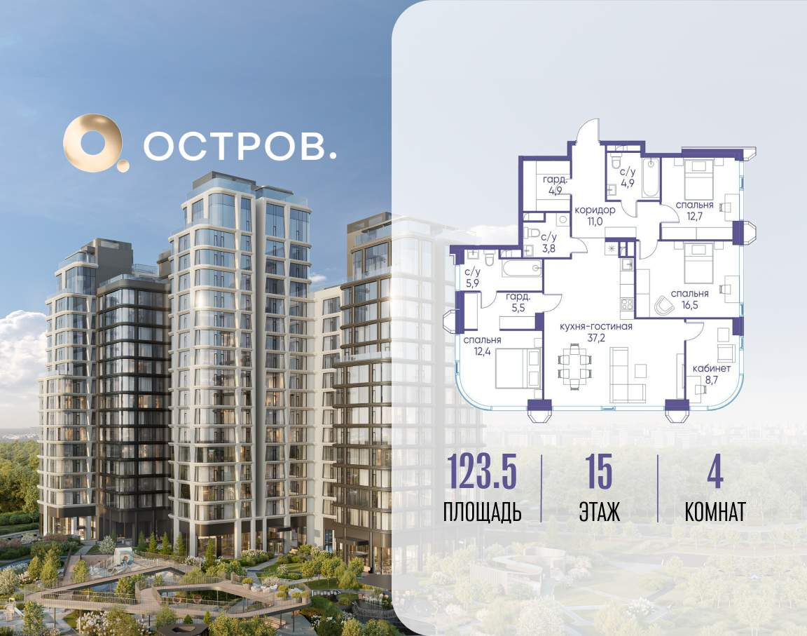 Продаётся 4-комн. квартира от застройщика: общая площадь 123.50 м, жилая 50.30 м, кухня 37.20 м, 15-й этаж, жилой квартал «Остров 12», корпус 1 (секция 2) . Срок сдачи: 1 квартал 2029 года.