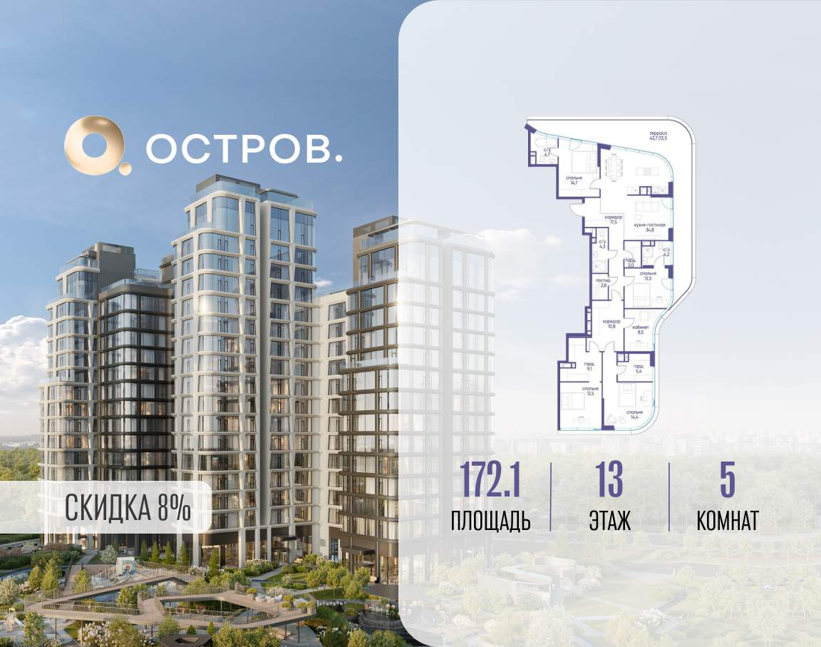 Продаётся квартира от застройщика: общая площадь 172.10 м, жилая 62.60 м, кухня 34.80 м, 13-й этаж, жилой квартал «Остров 12», корпус 3 (секция 1) . Срок сдачи: 1 квартал 2029 года.