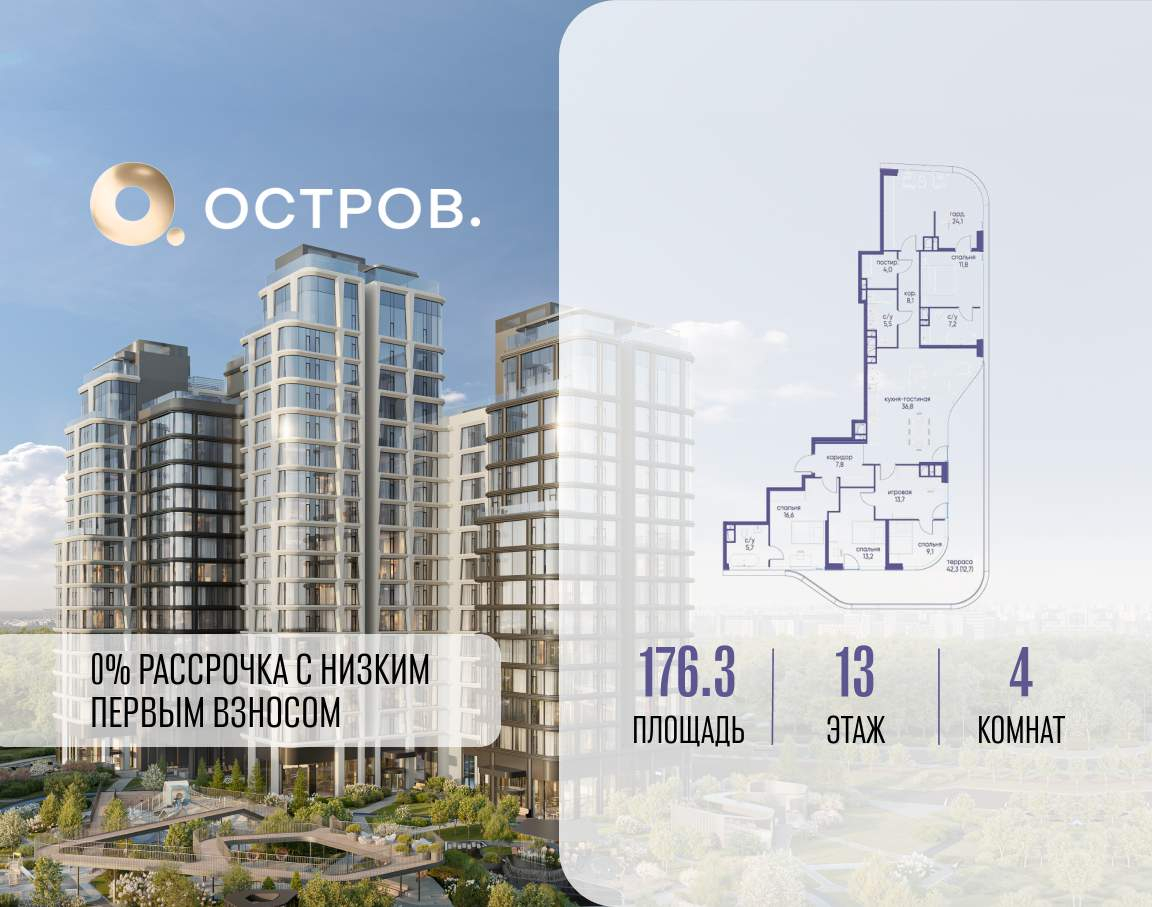 Продаётся 4-комн. квартира от застройщика: общая площадь 176.30 м, жилая 55.30 м, кухня 36.80 м, 13-й этаж, жилой квартал «Остров 12», корпус 6 (секция 1) . Срок сдачи: 1 квартал 2029 года.