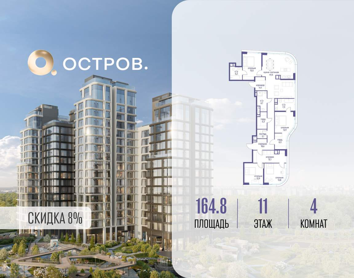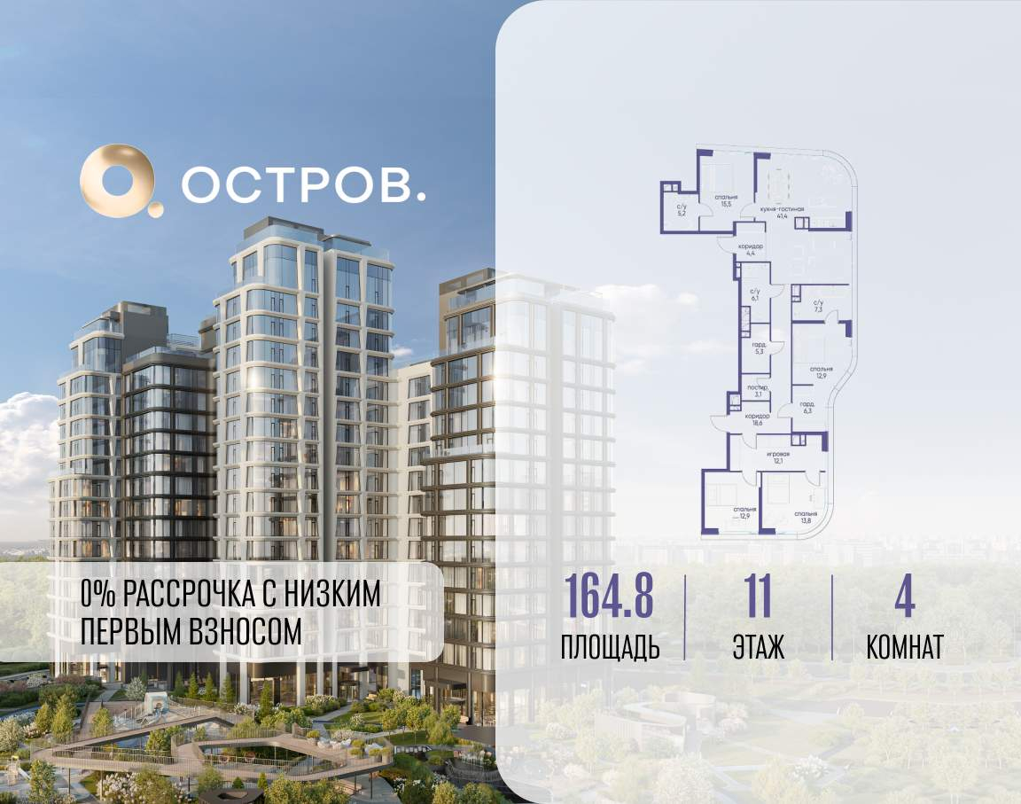 Продаётся 4-комн. квартира от застройщика: общая площадь 164.80 м, жилая 67.20 м, кухня 41.40 м, 11-й этаж, жилой квартал «Остров 12», корпус 6 (секция 1) . Срок сдачи: 1 квартал 2029 года.