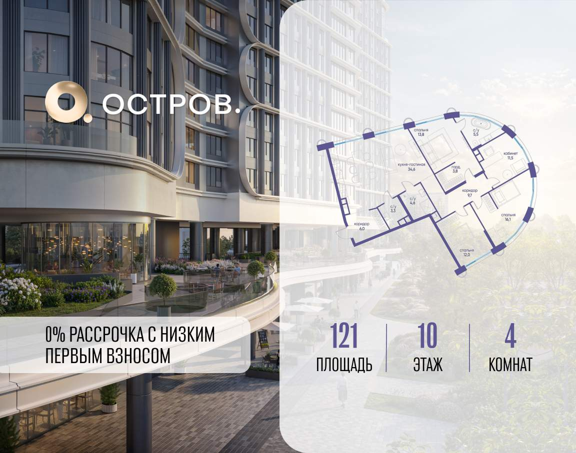 Продаётся 4-комн. квартира от застройщика: общая площадь 121.00 м, жилая 53.40 м, кухня 34.60 м, 10-й этаж, жилой квартал «Остров 7», корпус 7 (секция 2) . Срок сдачи: 3 квартал 2028 года.