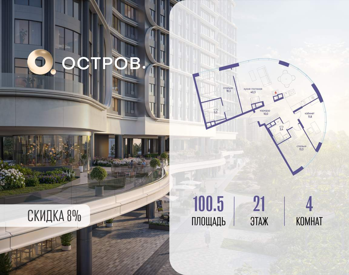Продаётся 4-комн. квартира от застройщика: общая площадь 100.50 м, жилая 43.40 м, кухня 40.30 м, 21-й этаж, жилой квартал «Остров 7», корпус 7 (секция 1) . Срок сдачи: 3 квартал 2028 года.