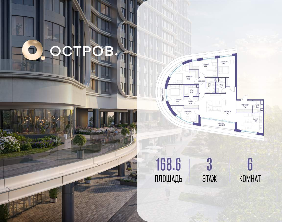 Продаётся квартира от застройщика: общая площадь 168.60 м, жилая 109.80 м, кухня 17.30 м, 3-й этаж, жилой квартал «Остров 7», корпус 4 (секция 3) . Срок сдачи: 1 квартал 2028 года.