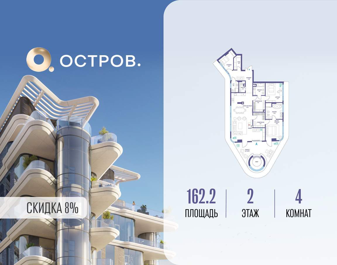 Продаётся 4-комн. квартира от застройщика: общая площадь 162.20 м, жилая 42.50 м, кухня 55.40 м, 2-й этаж, жилой квартал «Остров 10», (секция 1) . Срок сдачи: 2 квартал 2026 года.