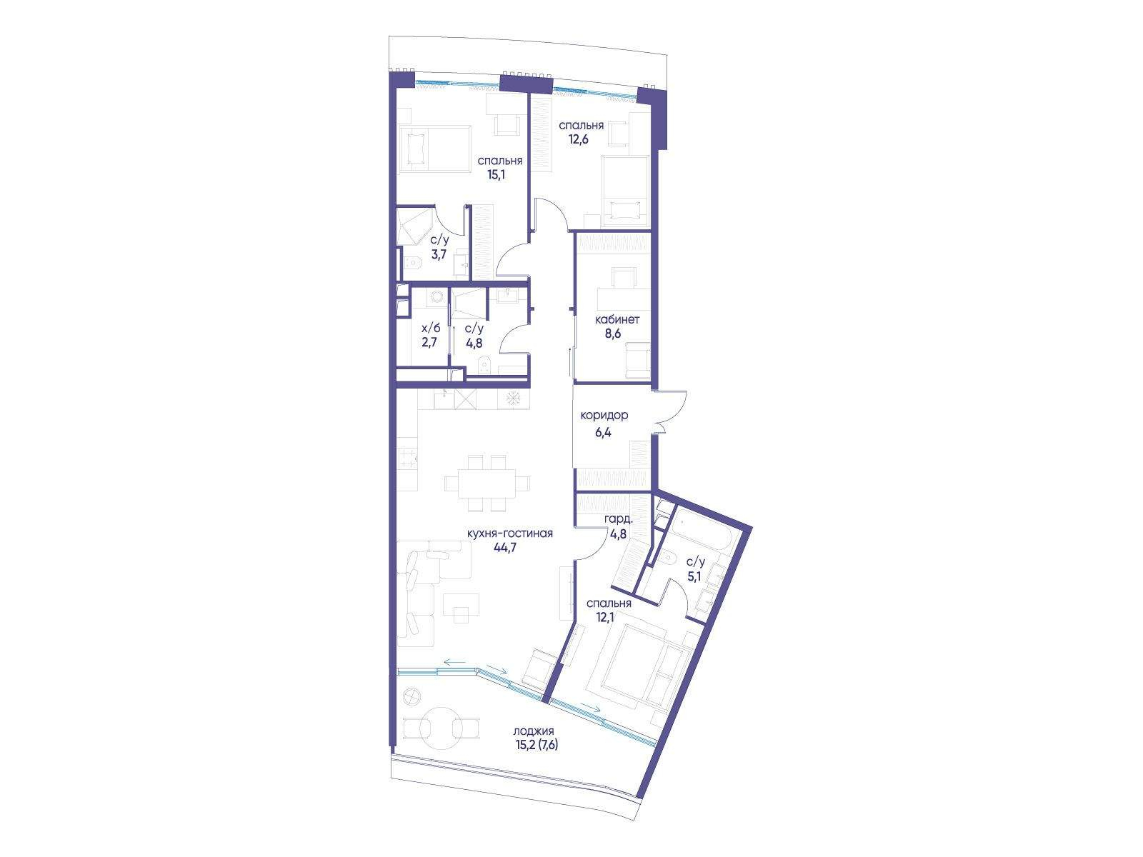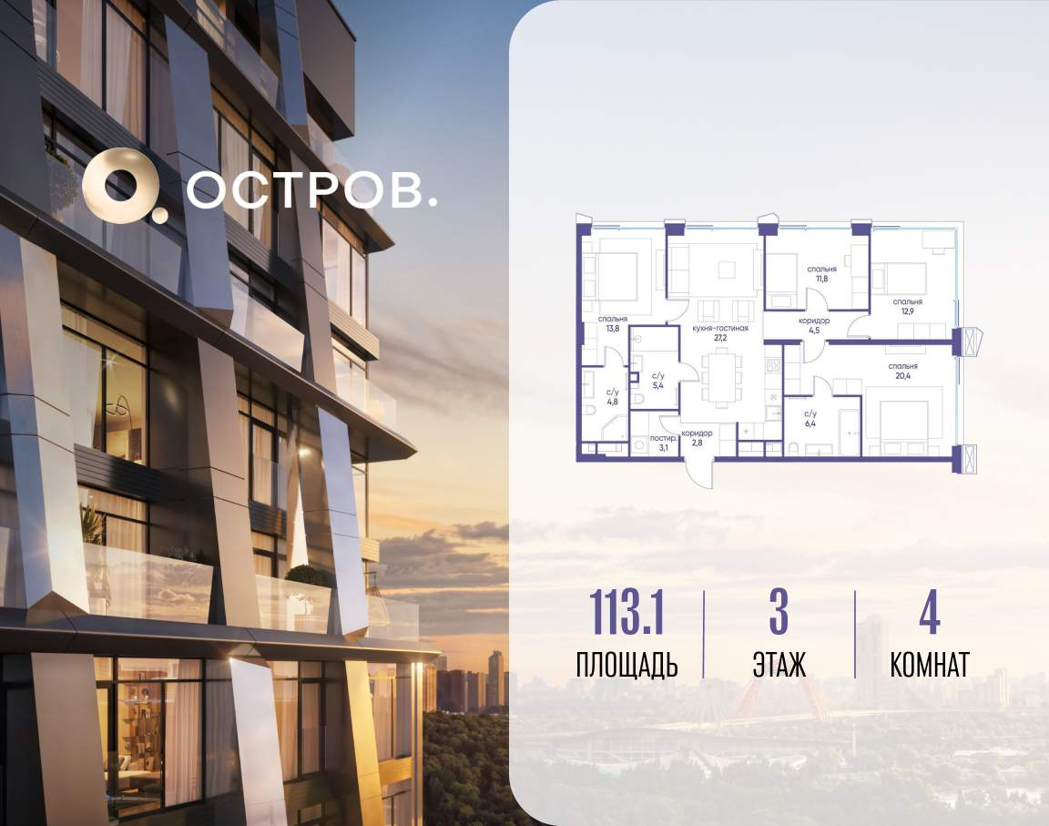 Продаётся 4-комн. квартира от застройщика: общая площадь 113.10 м, жилая 58.90 м, кухня 27.20 м, 3-й этаж, жилой квартал «Остров 12», корпус 2 (секция 1) . Срок сдачи: 1 квартал 2029 года.