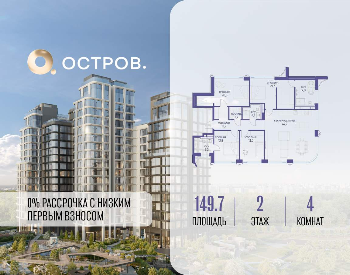 Продаётся 4-комн. квартира от застройщика: общая площадь 149.70 м, жилая 68.80 м, кухня 47.70 м, 2-й этаж, жилой квартал «Остров 12», корпус 2 (секция 1) . Срок сдачи: 1 квартал 2029 года.