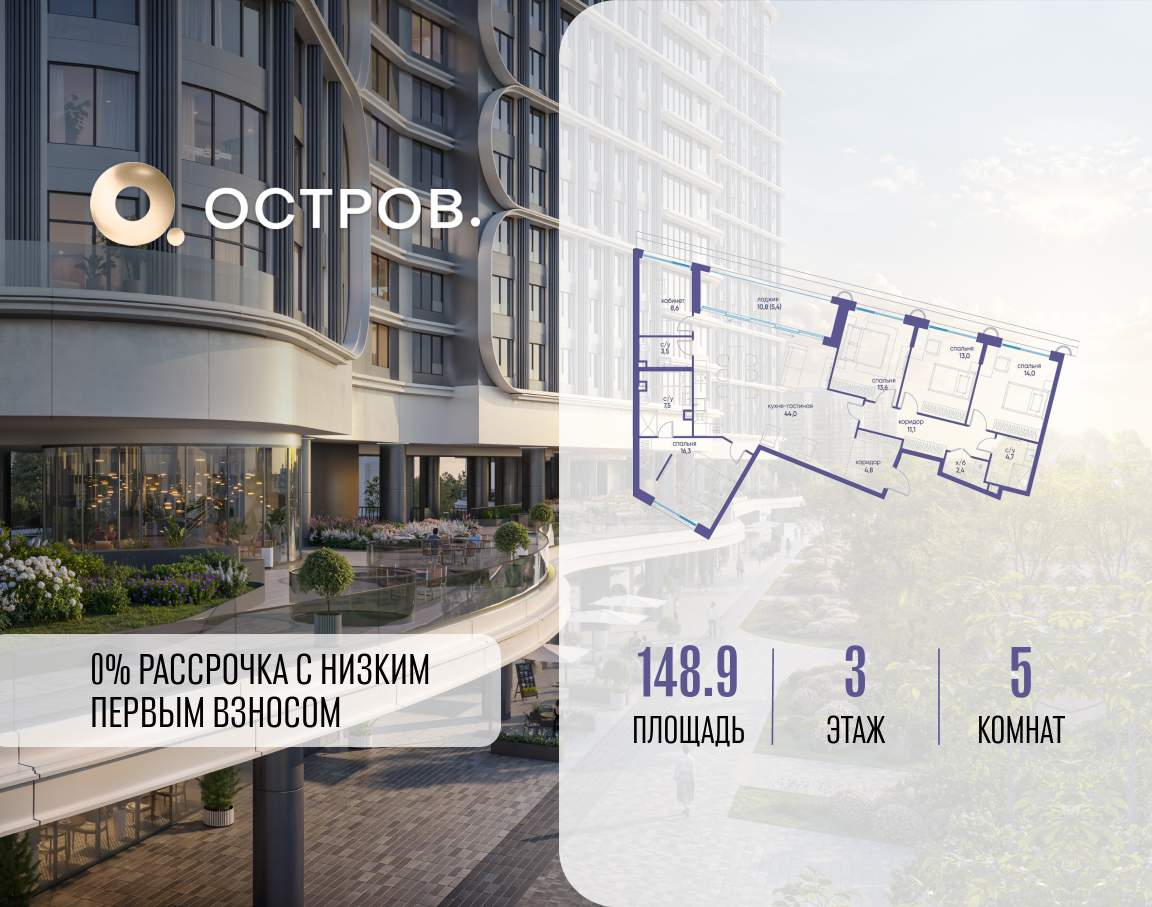Продаётся квартира от застройщика: общая площадь 148.90 м, жилая 65.50 м, кухня 44.00 м, 3-й этаж, жилой квартал «Остров 7», корпус 7 (секция 2) . Срок сдачи: 3 квартал 2028 года.
