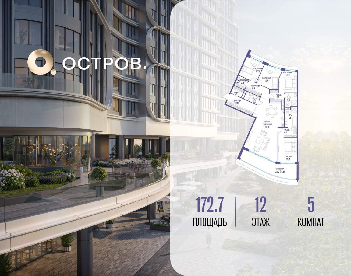 Продаётся квартира от застройщика: общая площадь 172.70 м, жилая 53.80 м, кухня 51.90 м, 12-й этаж, жилой квартал «Остров 7», корпус 3 (секция 2) . Срок сдачи: 1 квартал 2028 года.