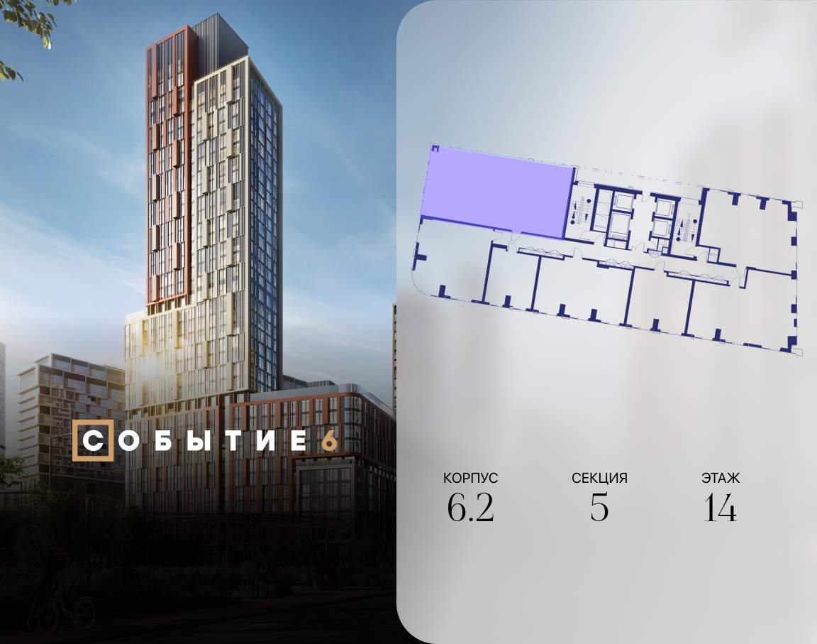Продаётся 4-комнатная квартира от застройщика: общая площадь 122.20 м, жилая 56.00 м, кухня 28.00 м, 14-й этаж, жилой квартал «Событие-6», корпус 2 (секция 5) Срок сдачи: 1 квартал 2029 года.
